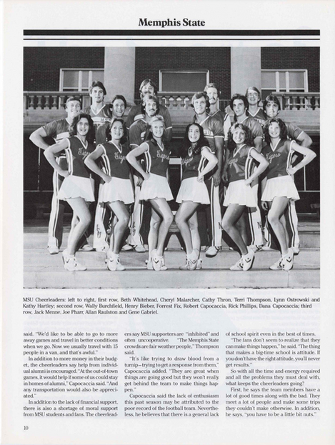 Known for their distinctive blue, gray and white uniforms, smiling faces and positive demeanors, the Memphis cheerleading team leads the crowds at U of M athletic events by performing a combination of cheers, stunts and high-flying basketball tosses. In addition to their game-day duties, the U of M cheer squads also compete on the national level in the D1A Small Coed division of the Universal Cheerleaders Association (UCA). Memphis’ large coed team claimed the 2013 title topping fellow national powerhouses Kentucky and Alabama, and have posted consecutive top 10 finishes since the national championship started. The All Girl cheer team won 2 titles between 2004-2012 and had consecutive top 4 finishes in other years. Since entering the Small Coed division, they have won 5 national titles in the last 9 years.